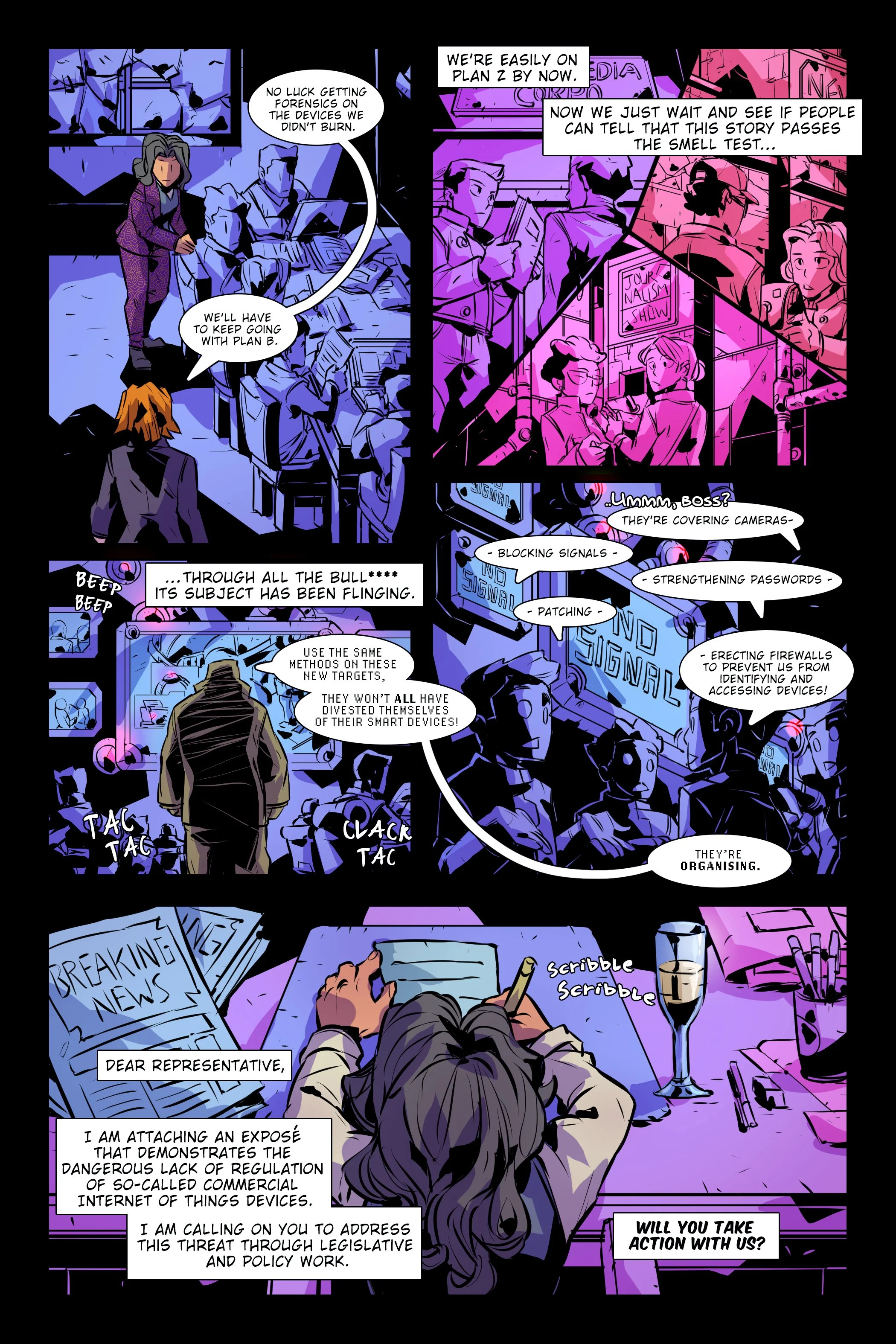 The fourth strip, Touch and Go usually means a situation is dangerous or precarious, which I felt was a perfect title for a scene in which the team tries to outsmart the Adversary and rid themselves of compromised devices. It's also a nod to how physically embedded Internet of Things devices are, and their threats — in our homes, on our bodies, everywhere.