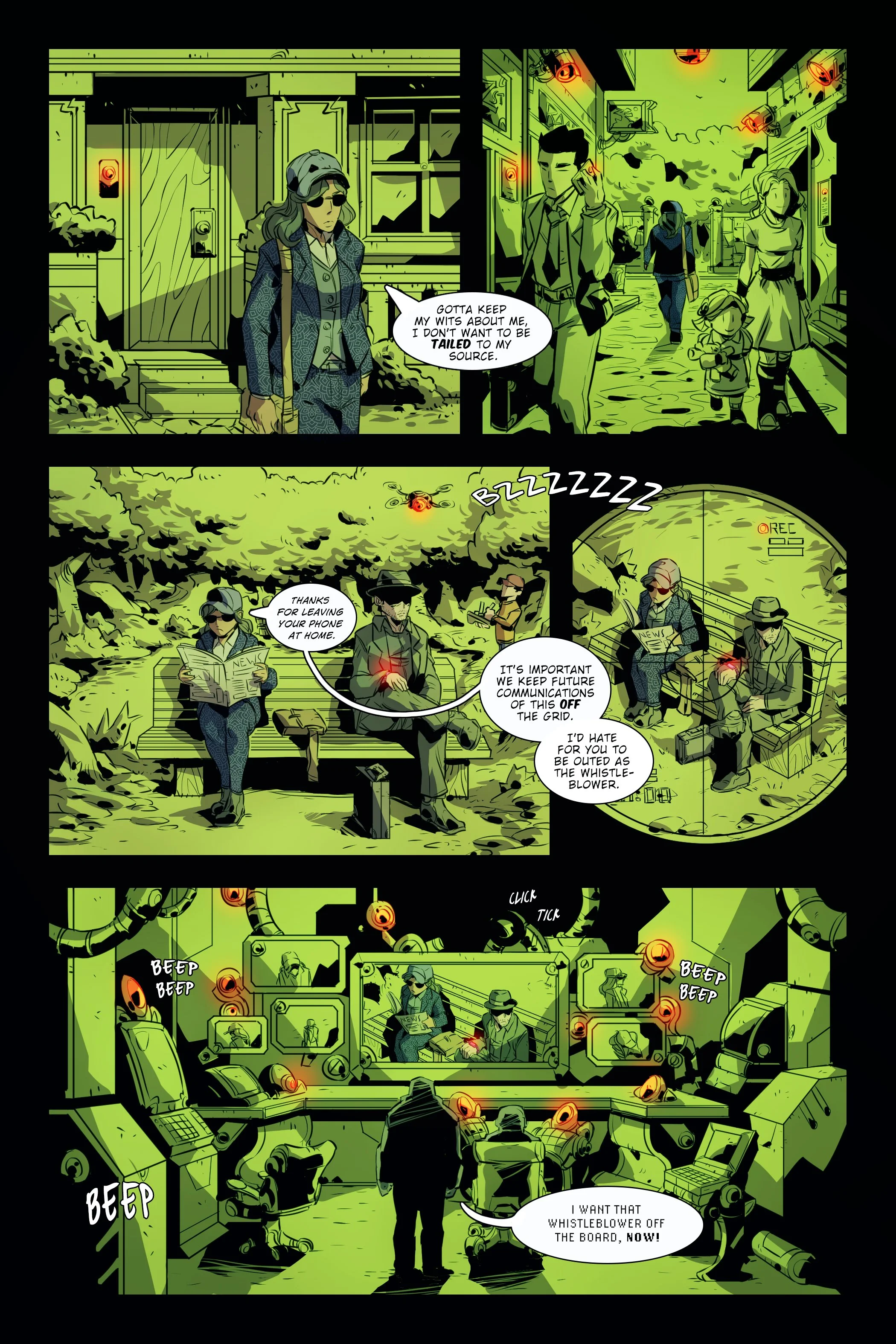 The first strip is called Seeing Red. Typically, this idiom means someone is furious. But the irony here is that J isn't angry at all, yet she doesn't realise the red lights around her, a visual cue for Internet of Things surveillance, signal that all these devices are silently watching, recording and analysing. The title's joke is that it's the only time in the entire comic book when J's not seeing red because she hasn't yet seen the real threat.